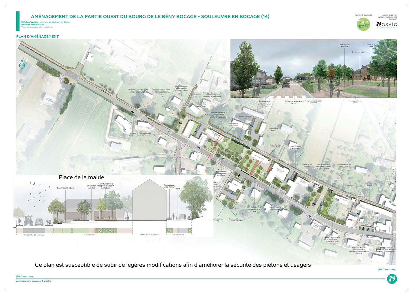 Le projet final a aussi pour ambition de créer une unité visuelle où le végétal sera mis en valeur de la médiathèque jusqu’à la Mairie. Du mobilier urbain permettra de profiter des points de vue remarquables vers le Bocage virois.