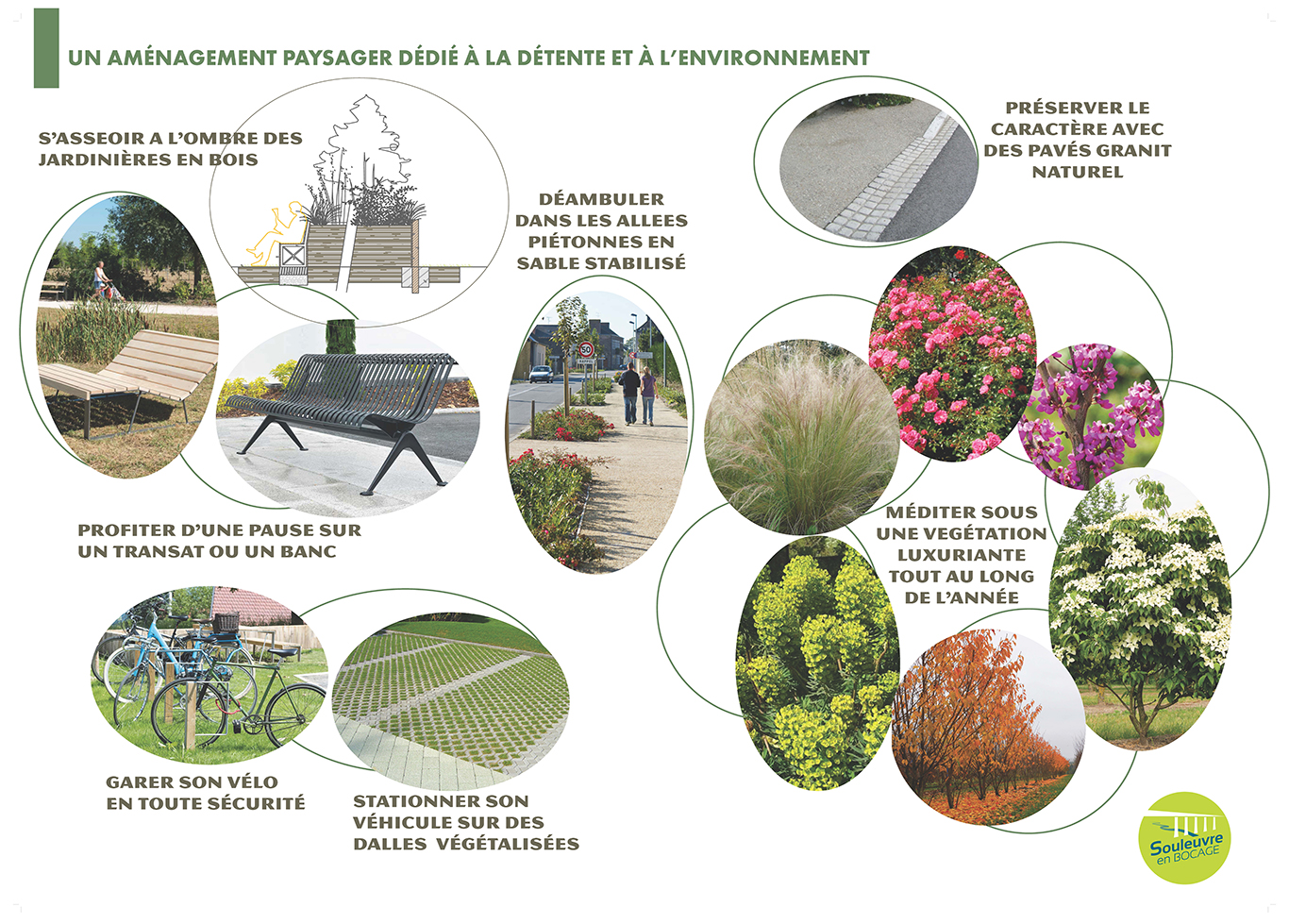 » Respecter le cadre paysager et le patrimoine du bourg en désimperméabilisant les sols, en revégétalisant les espaces et en valorisant les matériaux locaux (pierre de construction).