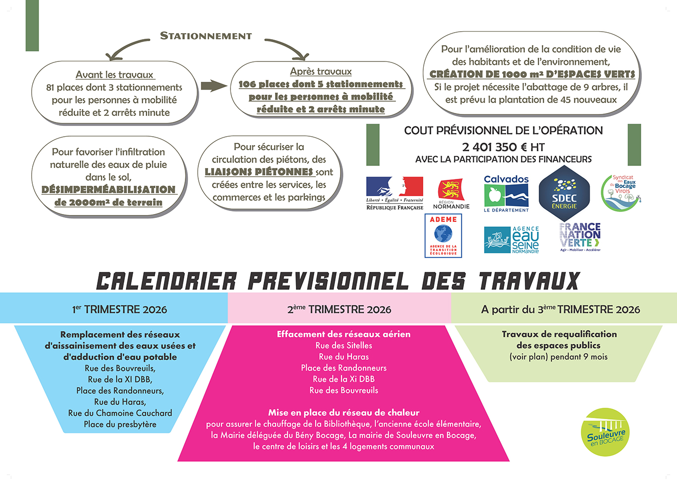 Les travaux ont démarré en ce mois de mars 2026 dans le bourg du Bény Bocage et se dérouleront en plusieurs tranches jusqu’à l’été 2027 pour ne pas paralyser la vie du bourg et pour s’articuler avec les autres projets et travaux nécessaires.