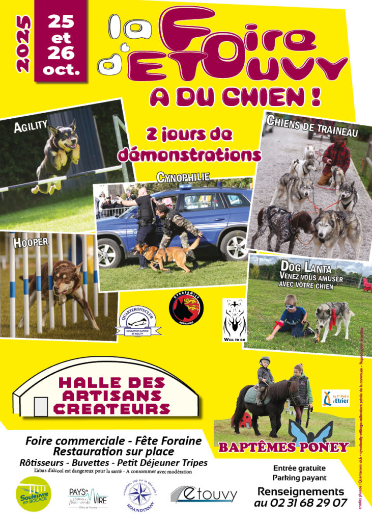 Le club Quarterons de Giéville viendra présenter ses activités de Hooper et d’Agility, l’association Cynofamily de Falaise fera des démonstrations avec des chiens de gendarmerie retraités comme la recherche de drogue, du mordant… Enfin la société Will To Go de Lénault fera découvrir son activité de musher avec ses chiens de traineau et proposera au public des activités de jeux d’équipe à tout propriétaire qui viendrait avec son chien à la foire d’Etouvy : le Dog Lanta. Alors, n’hésitez à venir vous amuser avec votre fidèle compagnon. Un bon moment convivial à partager !